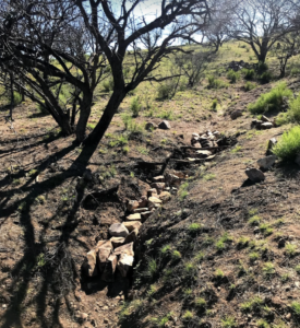 The main goal of this project is to maximize the benefits of rainwater for the ecosystem and wildlife. In arid areas such as the Altar Valley, every drop of water is precious. Rainwater can flow quickly off of the land and into deep channels without sinking into the soil for animals and vegetation to use. Low-technology structures made of rock and brush, such as one-rock dams and baffles, slow and spread the flow of water so that rather than rushing down a channel, it can sink slowly into the soil and spread into its natural floodplain. With more water available in the soil, plants can grow more easily, bringing a greater diversity of vegetation and wildlife to the area.